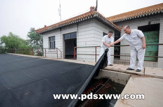 7月18日上午,為有效抑制水中藻類滋生,市自來水公司白龜山水廠工作人員在為網(wǎng)格反應(yīng)池加蓋防藻遮陽棚,確保夏季用水高峰期供水安全。本報記者牛智廣攝